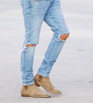 Beige suede Chelsea boots would look perfect for both types of knit jumpers especially for the plain knit jumper, though, as the boot are sleek, modern style. The cable knit jumper will also go well with a pair of beige suede Timberland boots, making the look more masculine, with thicker textures for a more rugged outcome, perfect for those cooler days.